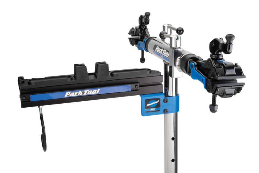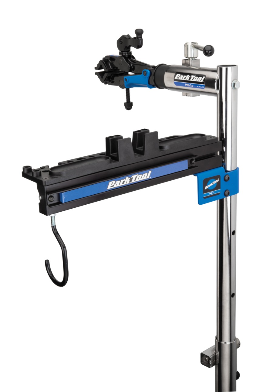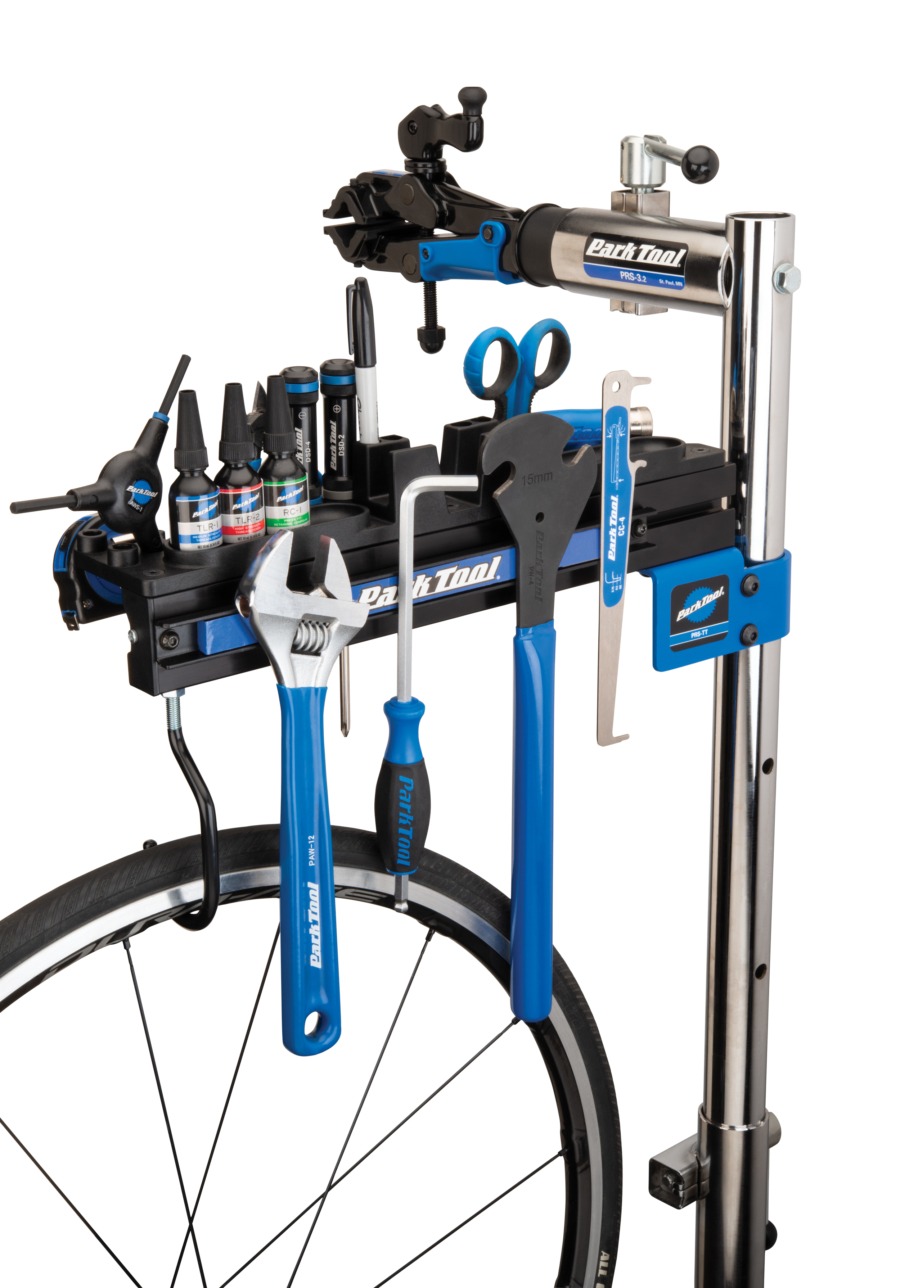 補給品及電子設備隨手放置於 Park Tool 維修架上,隨時取用。