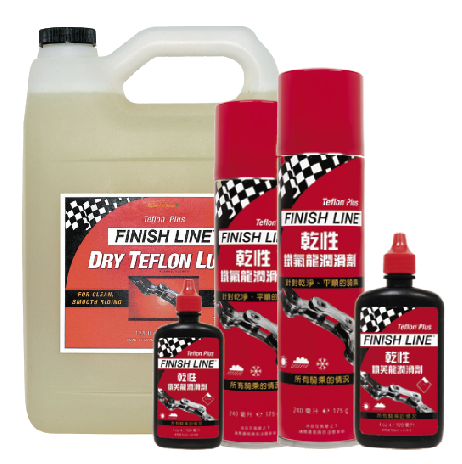乾性潤滑劑有極好的抗壓,抗水洗能力。是一款全功能、全天候皆適用的鏈條潤滑劑。您亦可將乾性潤滑劑使用於變速器、煞車系統及變速撥桿等樞軸,它具有超強的穿透力。Finish Line 終點線乾性潤滑劑提供了超棒的傳動效率,並且不會沾染過多的髒污。乾性潤滑劑是Finish Line終點線產品中最受歡迎、銷量最好、功能最全面的的潤滑劑。